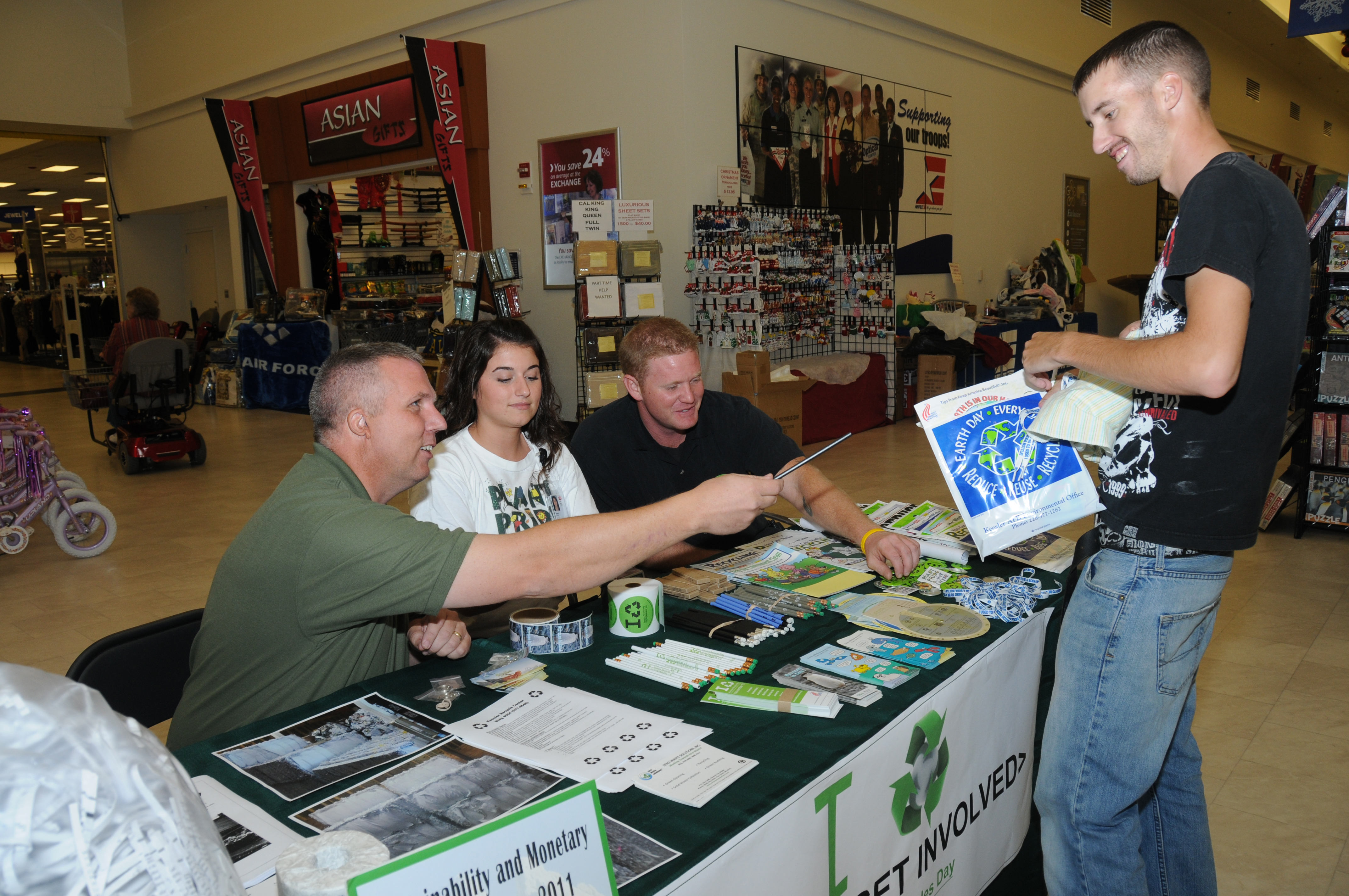 Petty Officer 3rd Class Anthony Moye, Naval Mobile Construction Battalion 7, Gulfport, Miss., receives recycling handouts Nov. 15, 2011, at the base exchange, Keesler Air Force Base, Miss., from Douglas Smith, contractor for Zero Waste Solutions at the Keesler Recycling Center and Amanda O’Neal and Aaron Carter, Lanier Environmental. The booth was on display to promote America Recycles Day. (U.S. Air Force photo by Kemberly Groue)