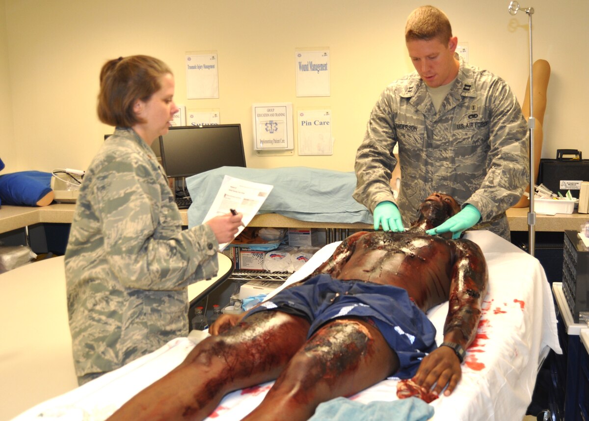 Maj. (Dr.) Heather Bright, 81st Surgical Operations Squadron, observes new surgery resident Capt. (Dr.) Jacob Anderson as he assesses “burn patient” Airman 1st Class Kenton Spencer during a June 15 advanced trauma life support training session. Dr. Anderson was among the new surgery and internal medicine residents who arrived at the hospital the first week of June. Dr. Bright explained the ATLS training was part of the orientation for the new residents to test their ability to manage patients involved in a trauma. Airman Spencer was among the four Aerospace Medical Apprentice Phase II course students who graduated June 17. (U.S. Air Force photo by Steve Pivnick)