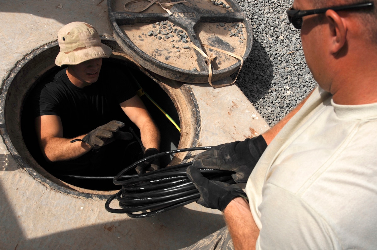 Airman 1st Class Theodore Nichols, left, grabs a bundle of fiber-optic cable from Staff Sgt. Christopher Billings at an air base in Southwest Asia. Airman Nichols is deployed from the 96th Communications Squadron, Eglin Air Force Base, Fla. Sergeant Billings is deployed from the 85th Engineering Installation Squadron at Keesler. They’re assigned to the 386th Expeditionary Communications Squadron. (U.S. Air Force photo by Staff Sgt. Patrick Dixon)