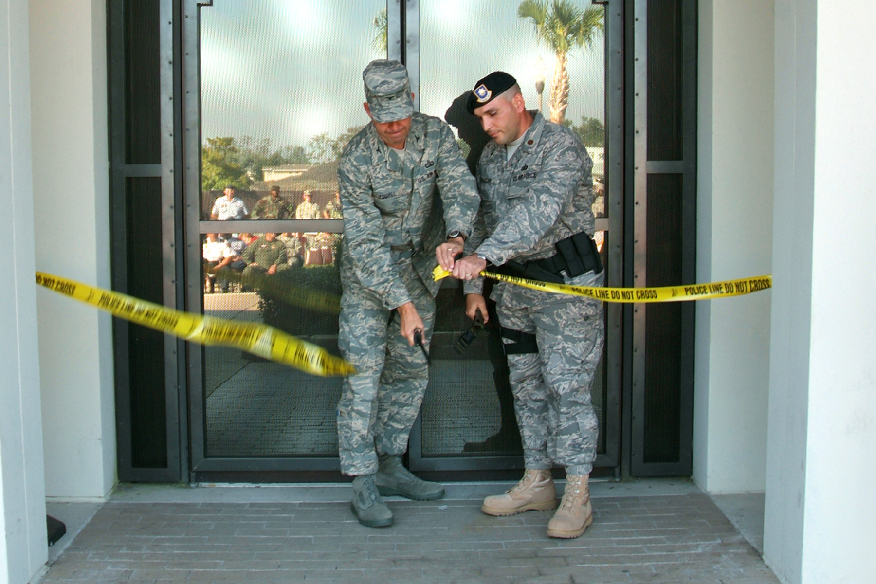 Left, Col. Greg Touhill, 81st Training Wing commander and Major Joseph Musacchia, 81st Security Forces commander cuts the ribbon during the squadron's building ribbon cutting ceremony on Monday 5 November. The building was heavily damaged during Hurricane Katrina in August, 2005. (U.S. Air Force photo by Adam Bond)