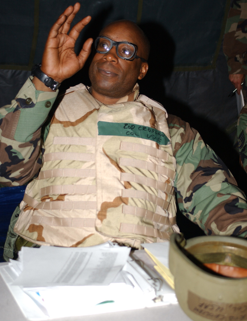 From left, Capt. Jeff Rich, Staff Sgt. Kevin Weaver, Tech. Sgt. Carrie Tilton and Capt. Tony Phillips discuss post-attack reconnaisance sweeps for unexploded ordnance outside their tents July 12. Captain Rich is from the inspector general’s office, Sergeant Weaver is from the 81st Contracting Squadron, Sergeant Tilton is from the 81st CPTS and Captain Phillips is from the legal office. (U.S. Air Force photo by Kemberly Groue)