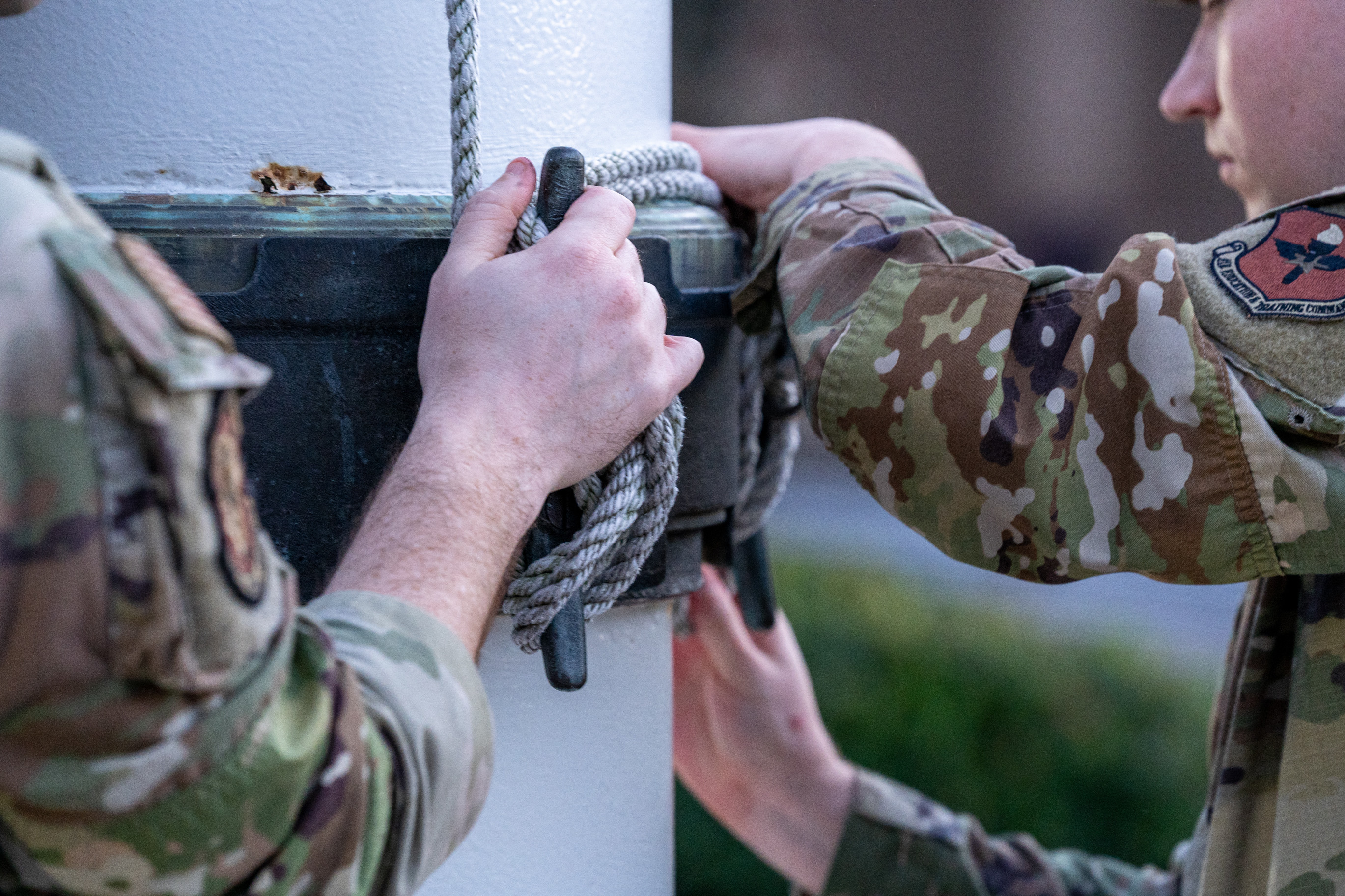 U.S. Air Force Senior Master Sgt. James Pennington, 336th Training Squadron first sergeant, stands at parade rest while holding a guidon during the 81st Training Wing’s monthly retreat ceremony at Keesler Air Force Base, Mississippi, Nov. 19, 2025. The ceremony, hosted by the 336th TRS, promoted a collective sense of unity, devotion and pride amongst different units on Keesler. (U.S. Air Force photo by Senior Airman Devyn Waits)