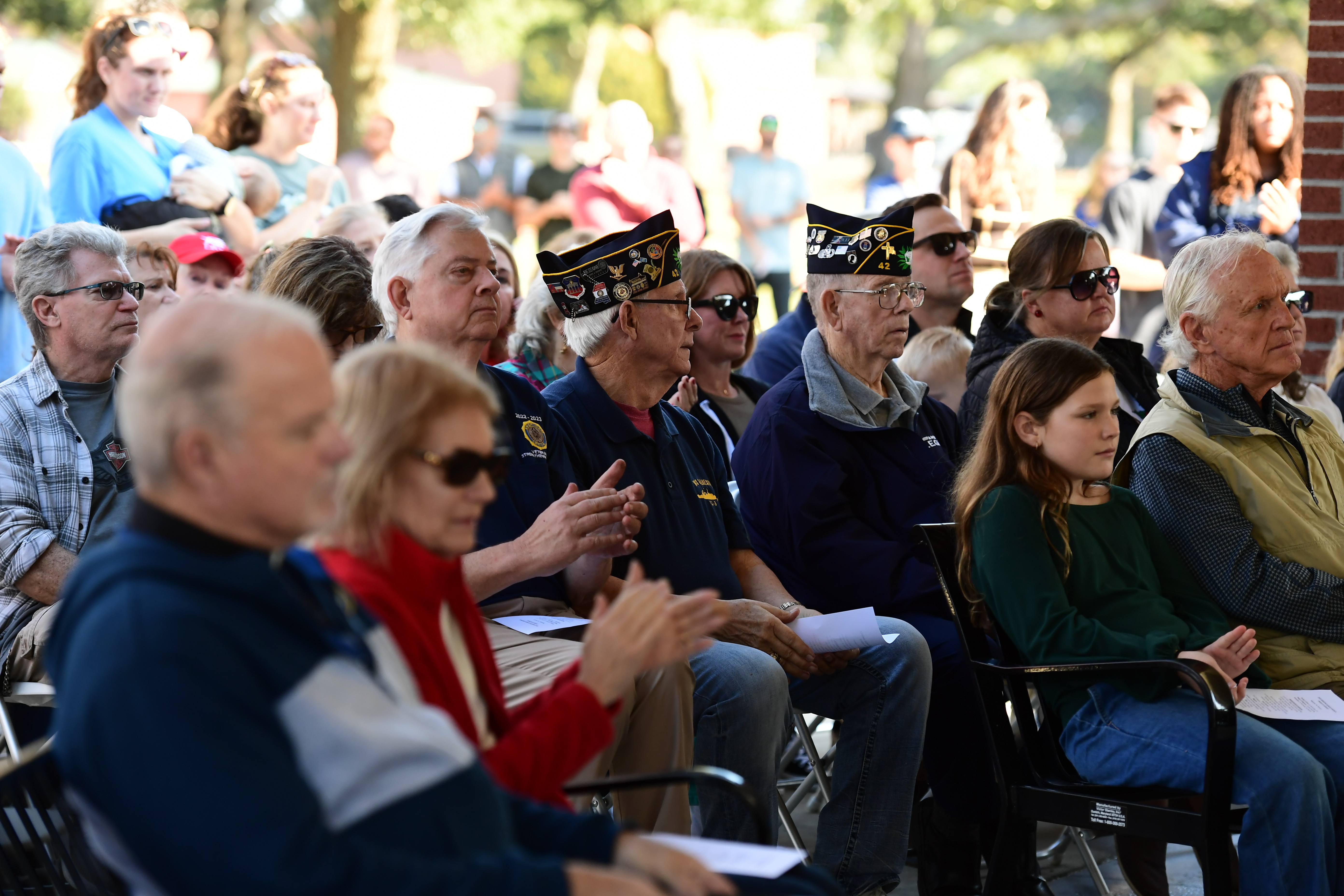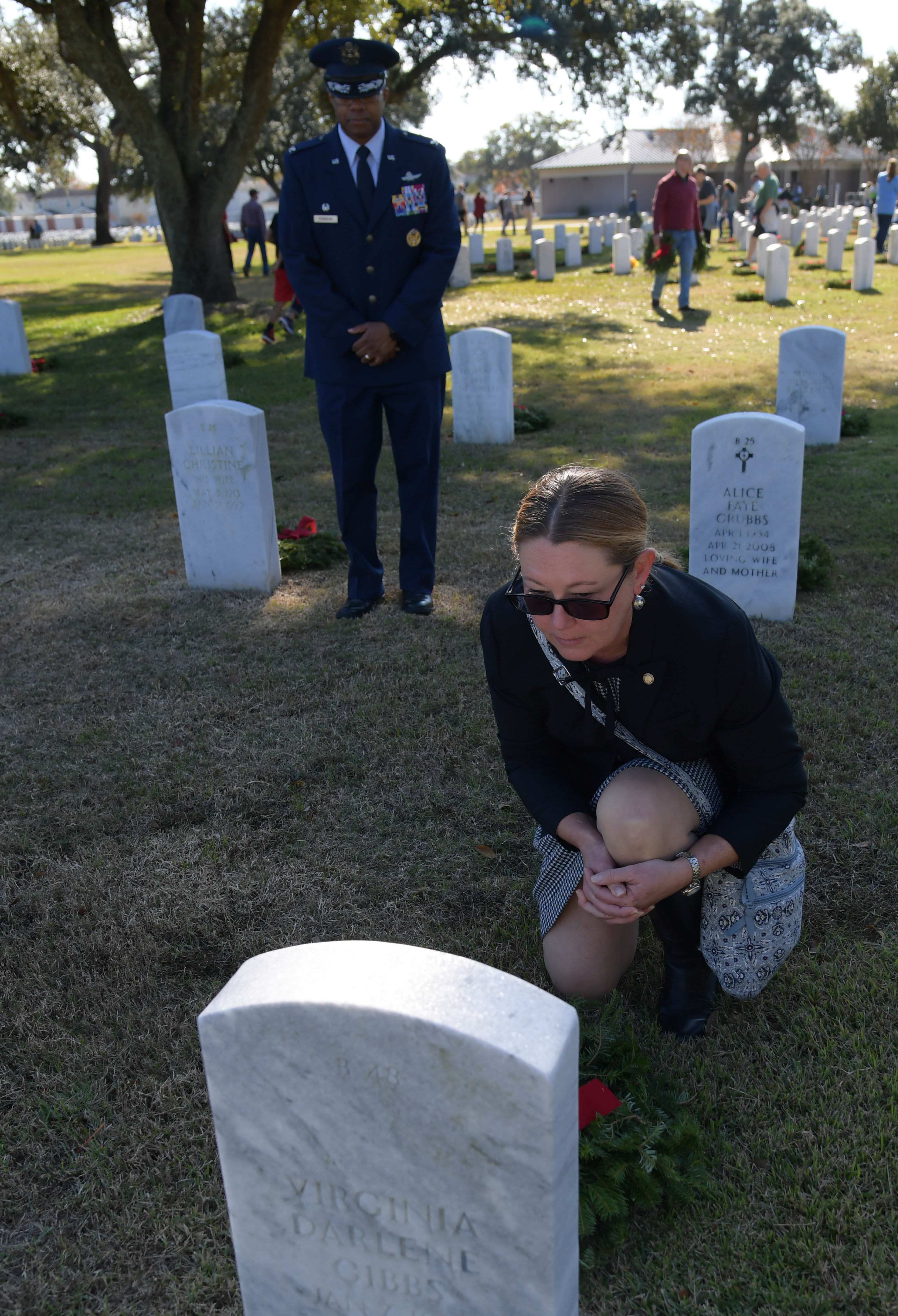 Christina Robinson observes a moment of silence after placing a wreath on a gravestone as her husband, U.S. Air Force Col. Chris Robinson, 81st Training Wing commander, stands by during the Wreaths Across America ceremony at the Biloxi National Cemetery, Biloxi, Mississippi, Dec. 13, 2025. Wreaths Across America, a non-profit organization, was formed as an extension of the Arlington Wreath Project. The annual event allowed military members, veterans and community members the opportunity to honor fallen service members by placing wreaths on their gravestones. (U.S. Air Force photo by Kemberly Groue)
