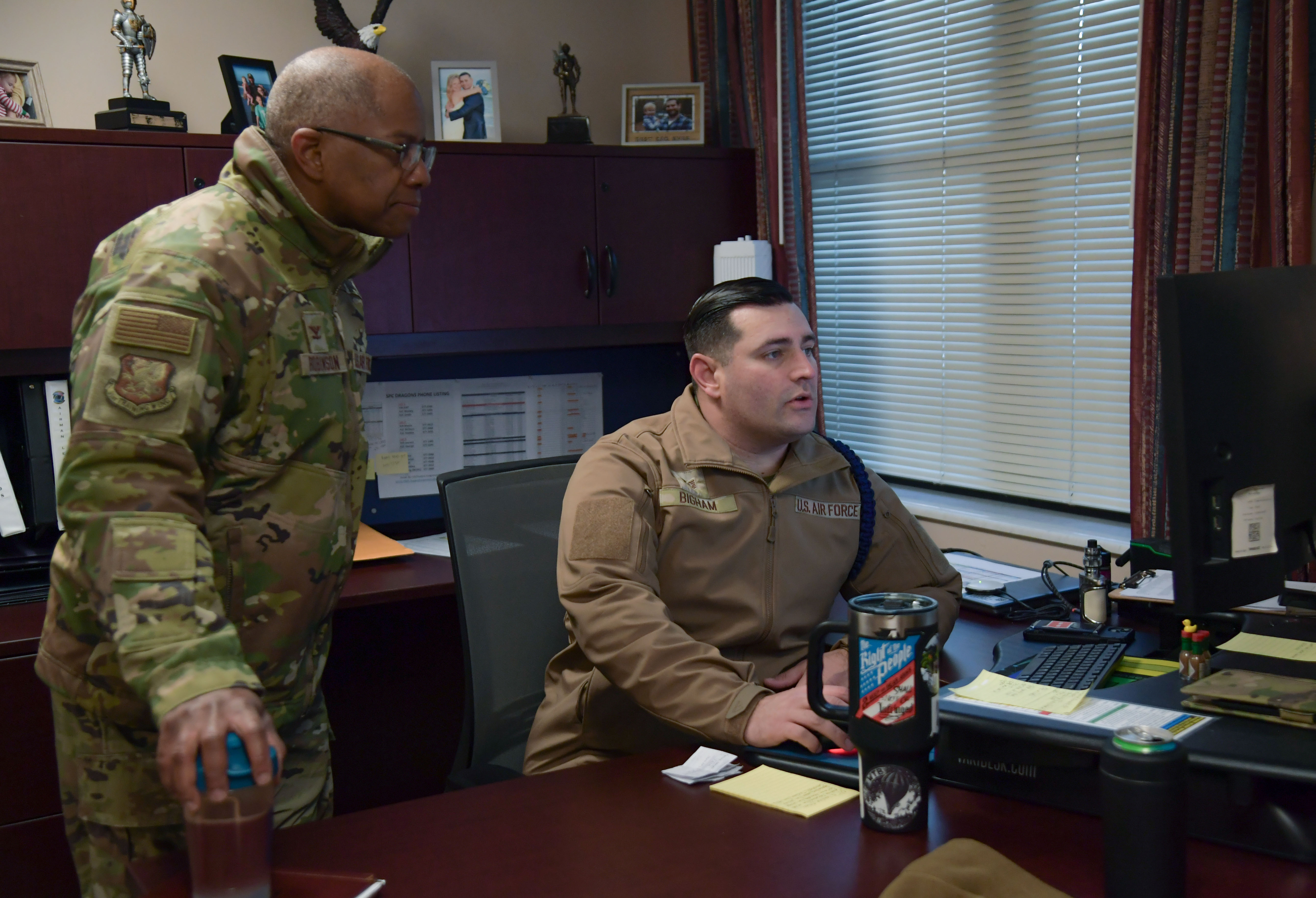 U.S. Air Force Staff Sgt. Nathan Mitchell, 338th Training Squadron military training leader, provides an accountability briefing to Chief Master Sgt. Ryan Taylor, 81st Training Wing command chief, and Col. Chris Robinson, 81st TRW commander, at Keesler Air Force Base, Mississippi, Dec. 15, 2025. Leadership from the 81st TRW participated in the MTL-for-a-day program in order to become more familiar with the operations and challenges faced by MTLs. An MTL is a first-line supervisor to non-prior service enlisted Airmen, which ensures Airmen continue to maintain military standards/discipline learned during Basic Military Training. They also monitor safety in formations, dormitories, and sports. (U.S. Air Force photo by Kemberly Groue)