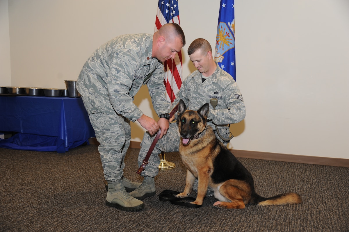 Maj. Brian Fitzpatrick, 81st Security Forces commander, helps Staff Sgt. Javonnia Peak, 81st SFS dog handler, change the collar of military working dog, Gino, during Gino’s retirement ceremony June 12, 2014, at the Roberts Consolidated Maintenance Facility, Keesler Air Force Base, Miss. Gino is eleven years old and served nine years of military service to the Air Force and has been adopted by his handler, Peak. (U.S. Air Force photo by Kemberly Groue)