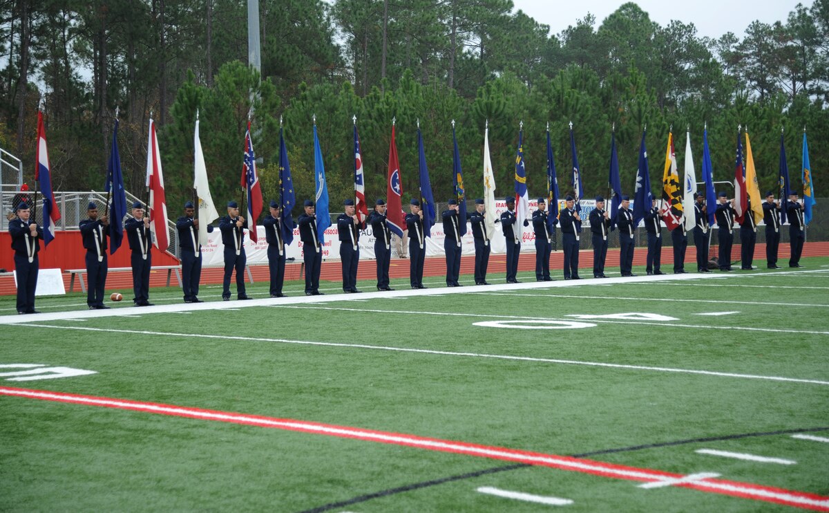 Brig. Gen. Patrick Higby, 81st Training Wing commander, Keesler Air Force Base, Miss., is followed by Dub Herring and Barry Harper, as they take their place on the field for the coin toss during a pre-game celebration at the 2013 Mississippi Bowl, Biloxi High School football stadium Dec. 8, 2013. The Keesler Honor Guard and Airmen carrying the 50-State flags also participated in the pre-game celebration. (U.S. Air Force photo by Kemberly Groue)