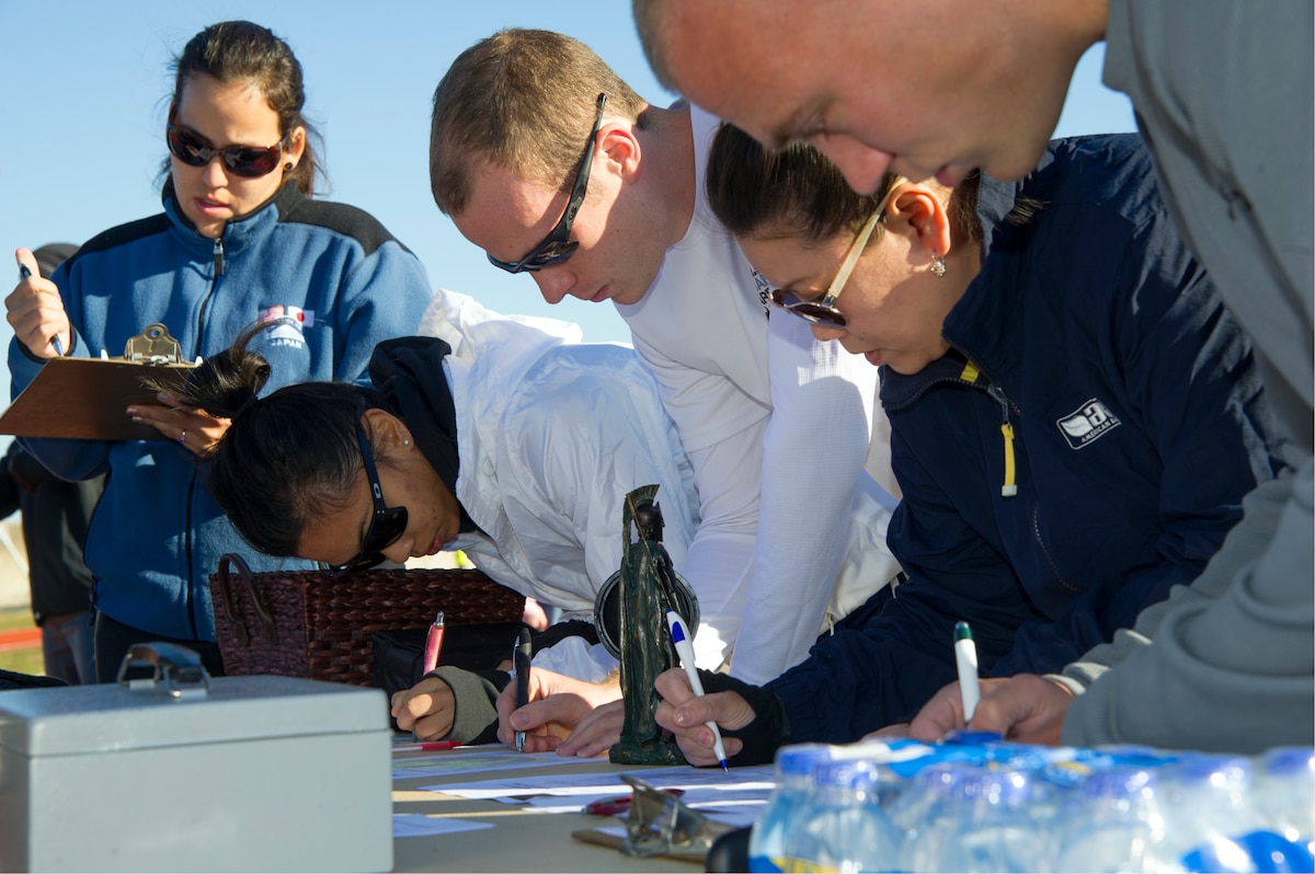Lt. Col. Whitney McCloud, 333rd Training Squadron commander, takes a group photo of the 53 individuals that participated in a 5km run Nov. 30, 2013, at Keesler Air Force Base, Miss. The event, sponsored by the 333rd Training Squadron key spouses, was in support of the Philippine typhoon relief effort. (U.S. Air Force photo by Adam Bond)