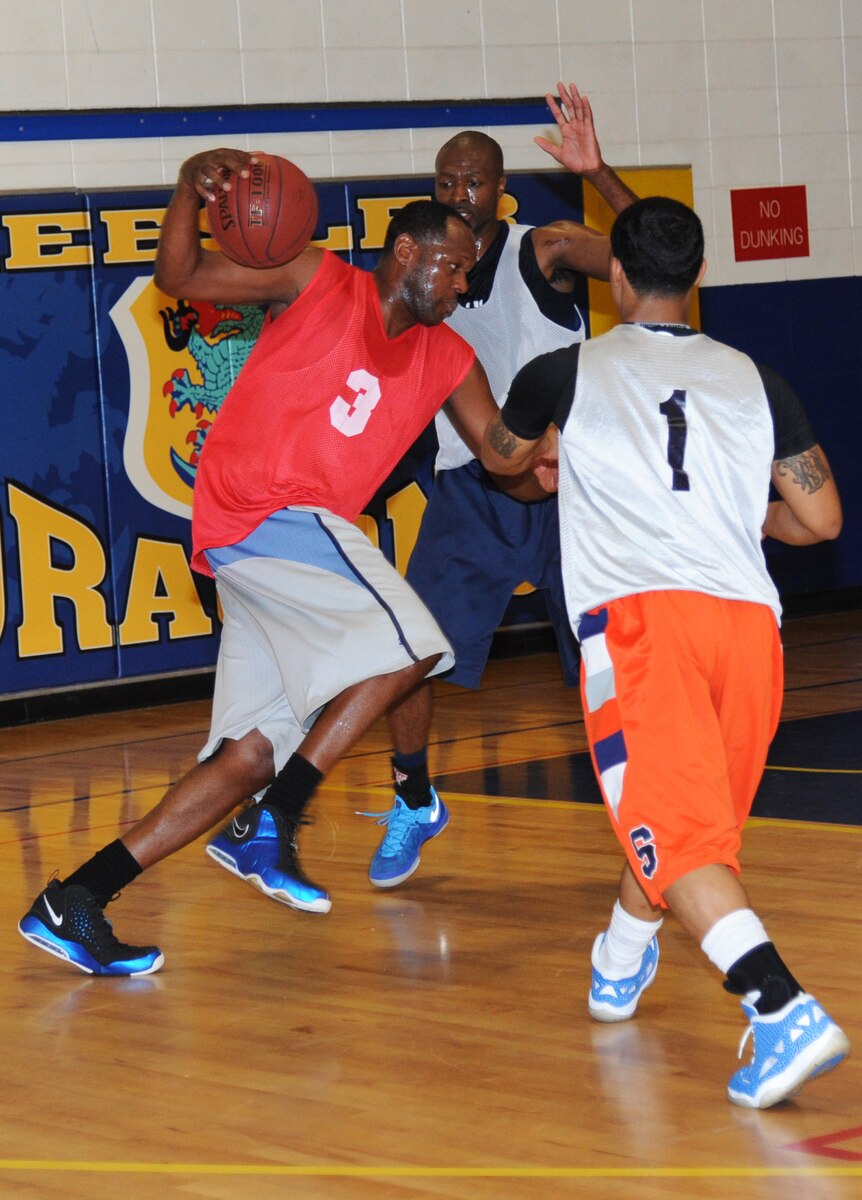 Alvin Holmes, 81st Medical Group, drives the ball past Tarek Salem, 81st Communications Squadron, while his team-mate, Parris Brown, plays defense during an intramural basketball game Aug. 12, 2013, at the Blake Fitness Center, Keesler Air Force Base, Miss. The 81st MDG defeated the 81st CS, 59-48. (U.S. Air Force photo by Kemberly Groue)